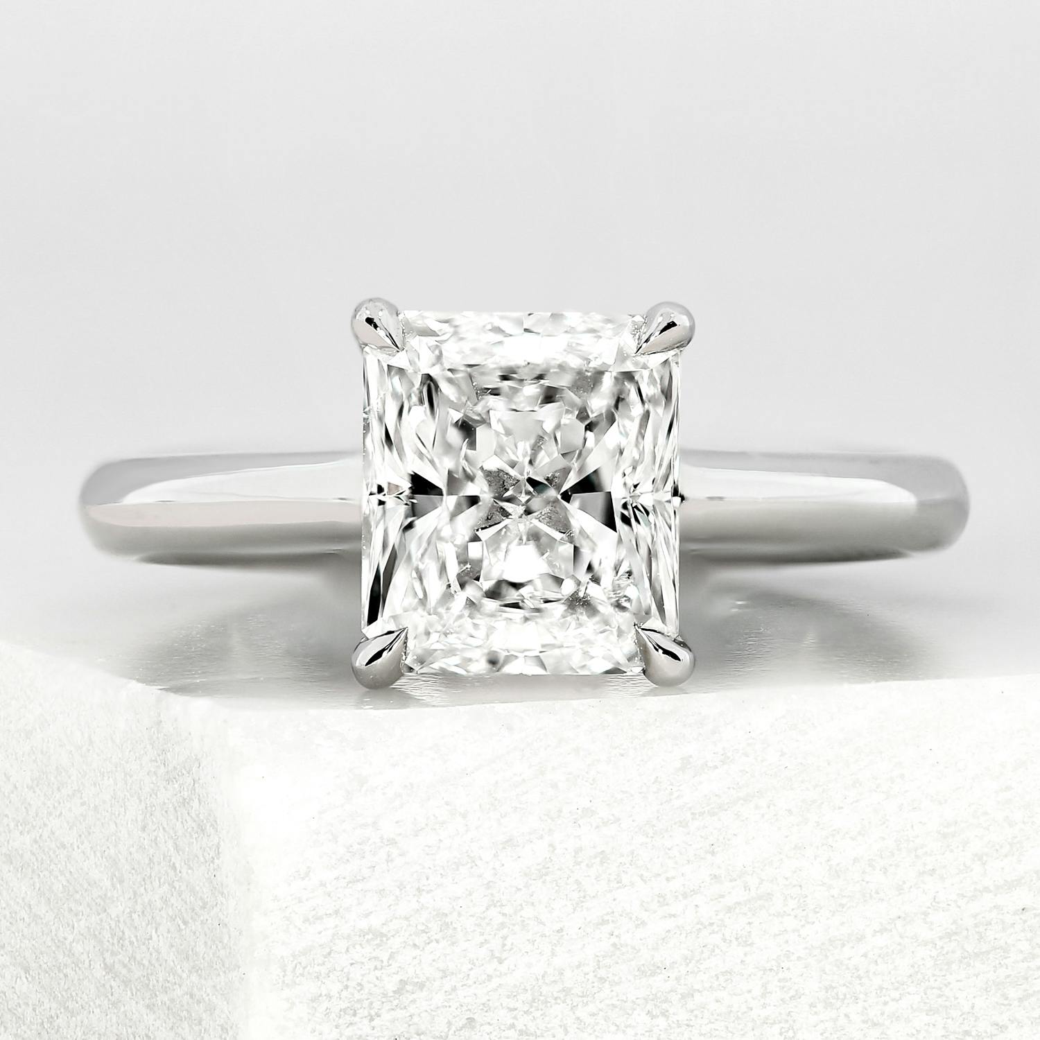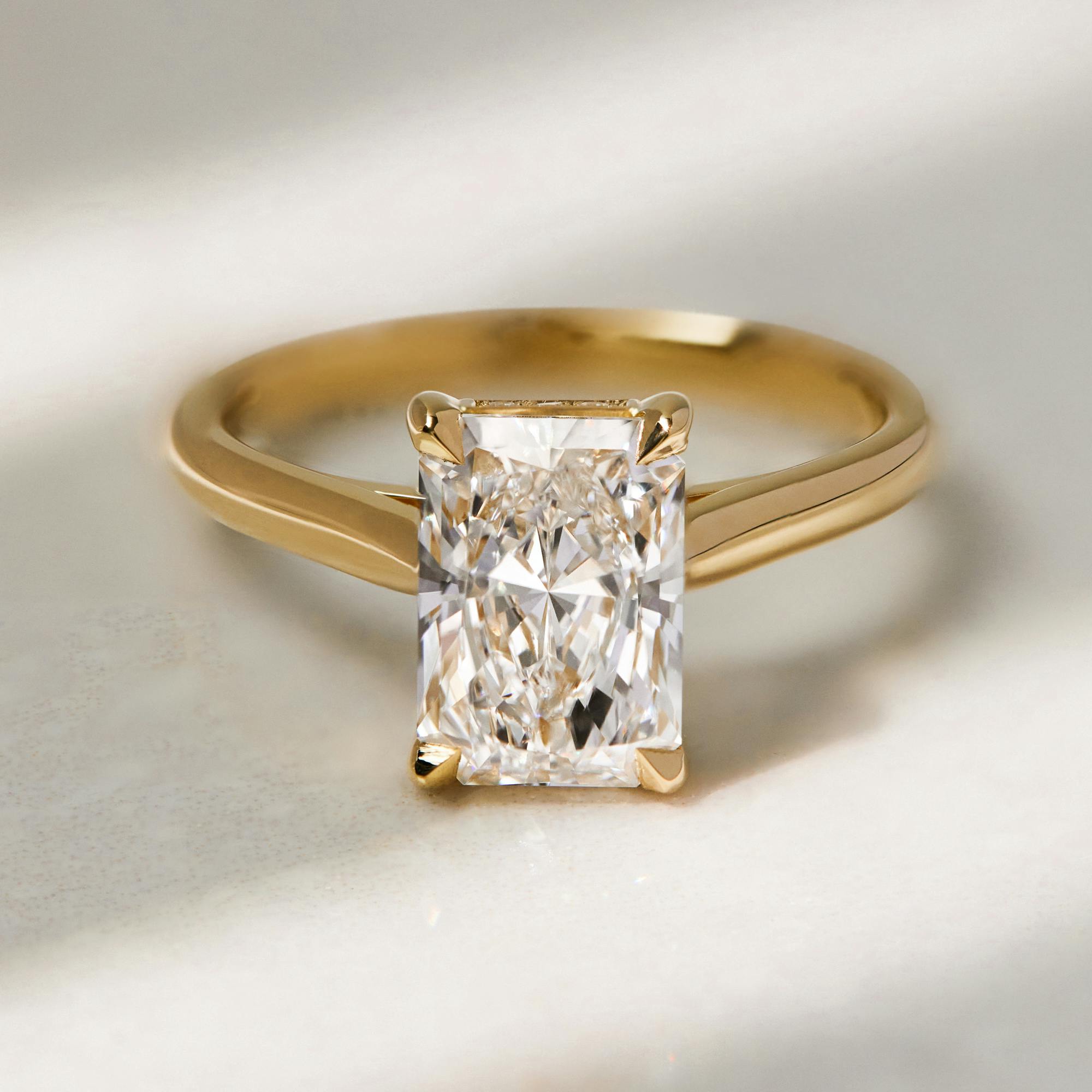 You can go slightly lower with your radiant diamond colour grade if you’re choosing a yellow gold or rose gold ring design, H at the very lowest. Poor colour grades can, however, contrast with the bright, icy tone of platinum, appearing more obvious.