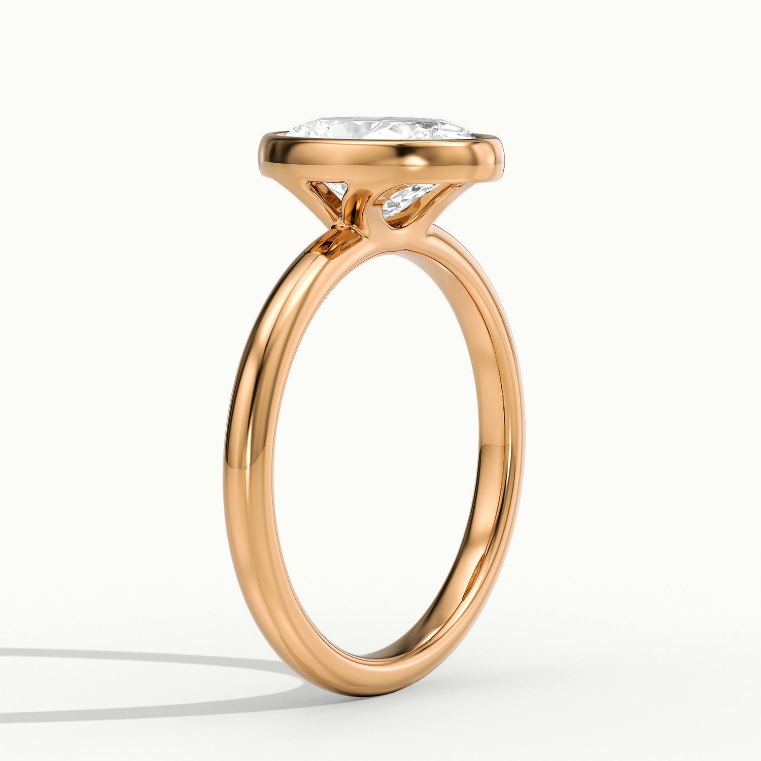 The Aubrey engagement ring in 18k rose gold with an oval diamond brings modern romance to a timeless silhouette. The oval cut diamond is secured in a smooth rubover setting, offering elegance and durability. The soft blush tones of rose gold add warmth and femininity, while the fine 2mm wedfit band rests perfectly flush against a weddking ring for an effortlessly refined look.
