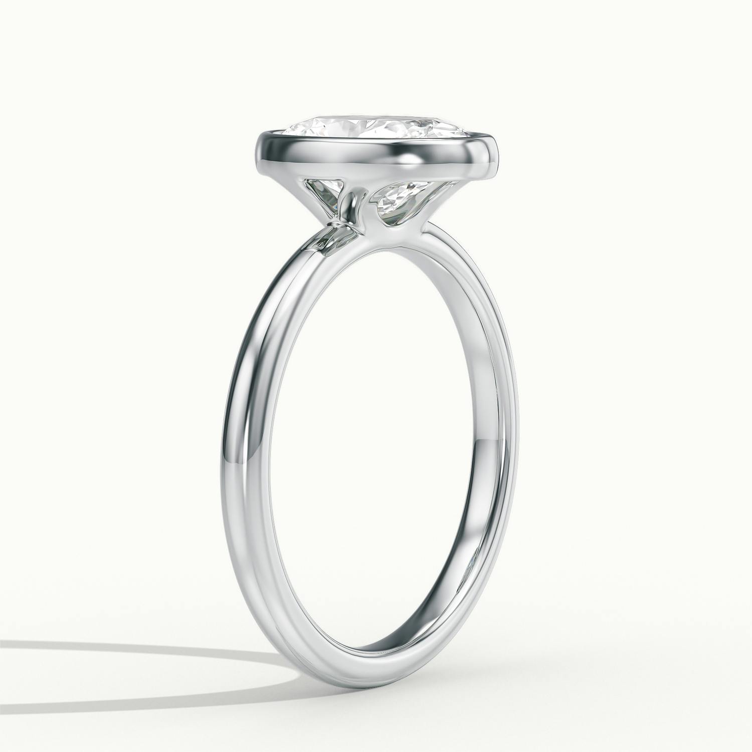 The Aubrey engagement ring in 18k white gold with an oval diamond radiates effortless sophistication. The oval diamond sits within a smooth rubover setting that enhances sparkle and provides both elegance and security. The sleek white gold band adds a cool, contemporary finish to this beautifully balanced design. The Aubrey is thoughtfully designed with a wedfit profile, crafted to sit perfectly flush with a wedding ring for timeless, effortless style.