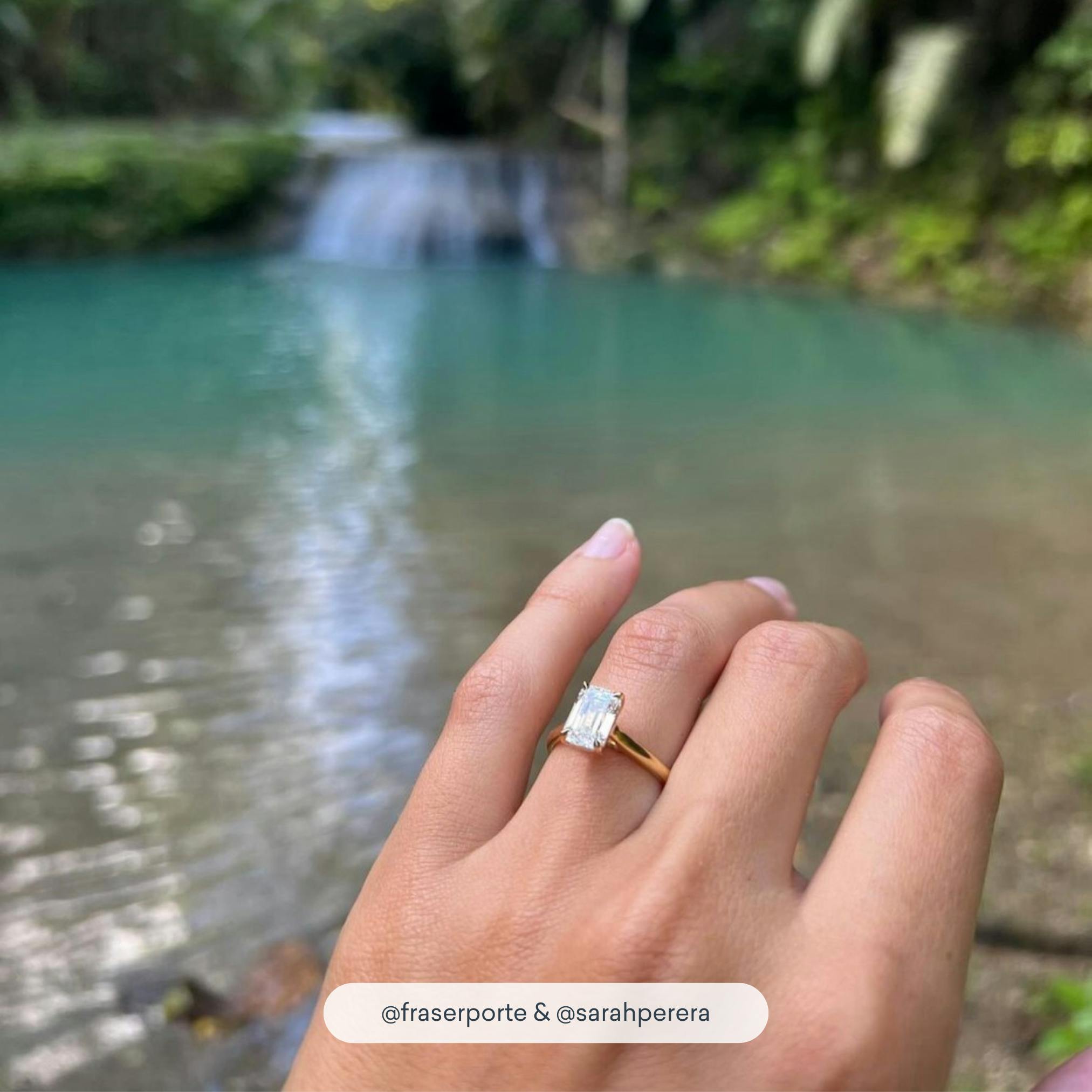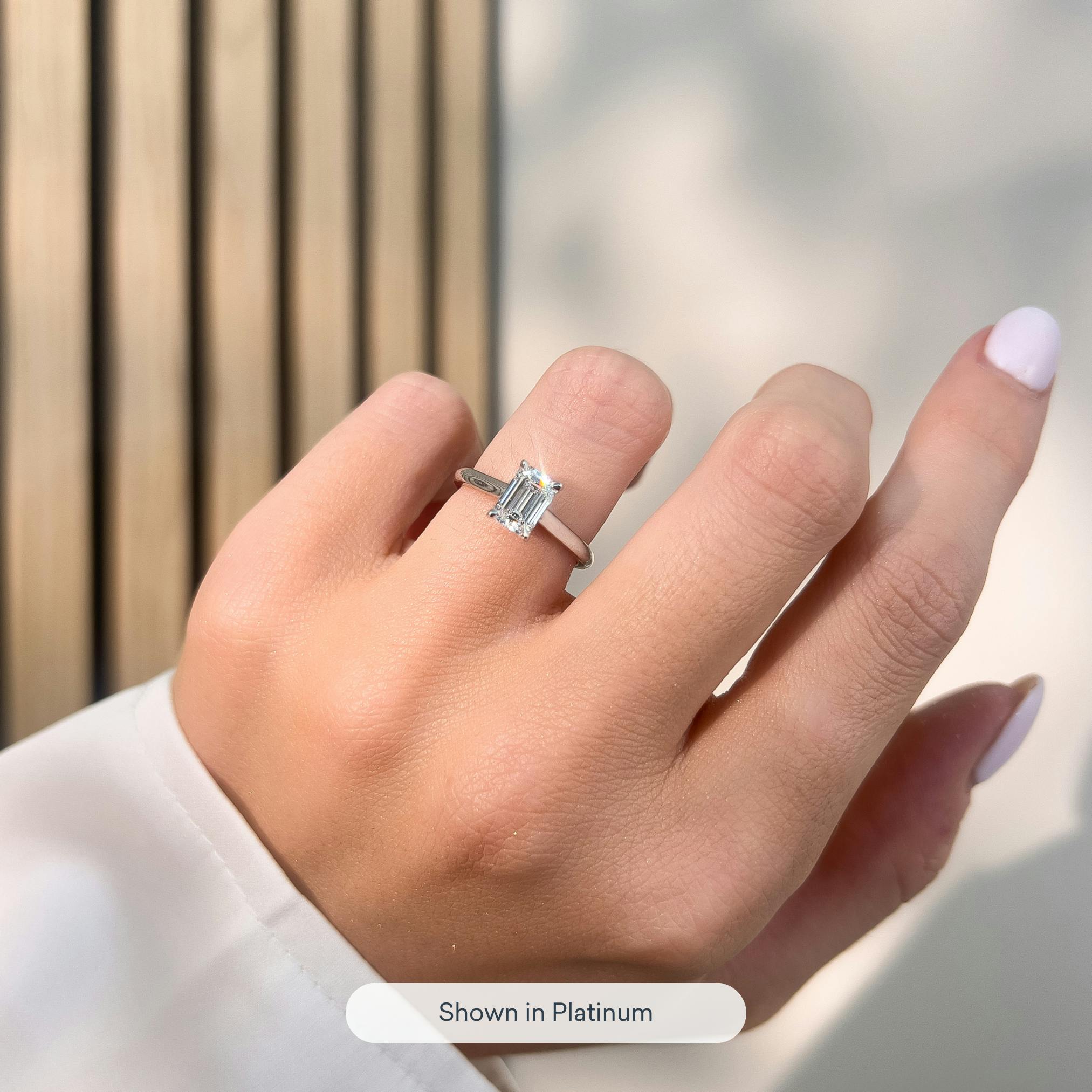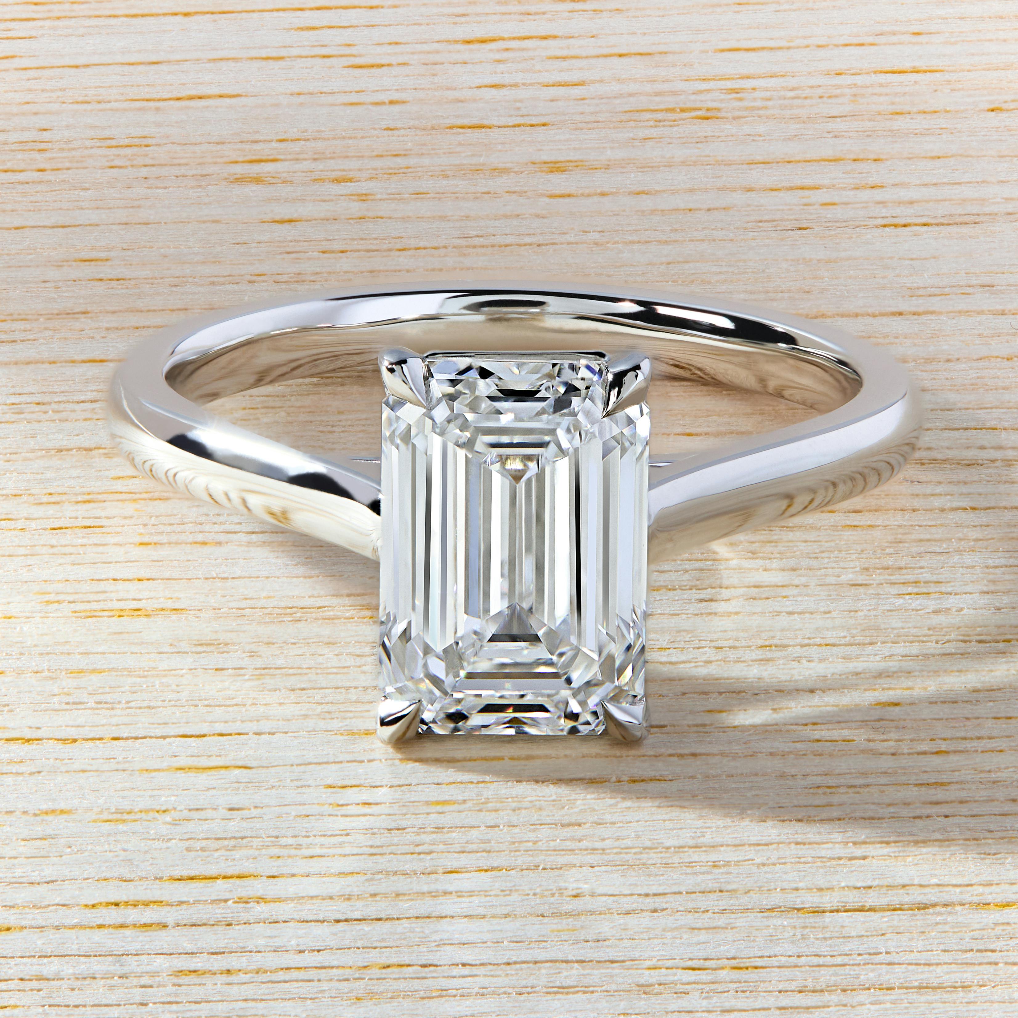 The Bardot engagement ring in 18k white gold with an emerald diamond.