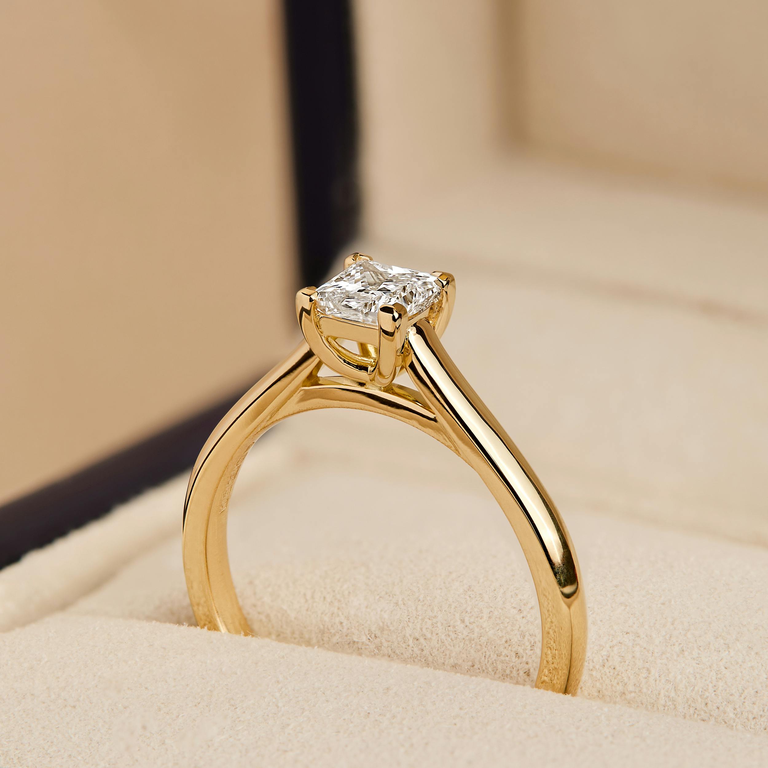 The Bardot engagement ring in 18k yellow gold with a princess diamond.