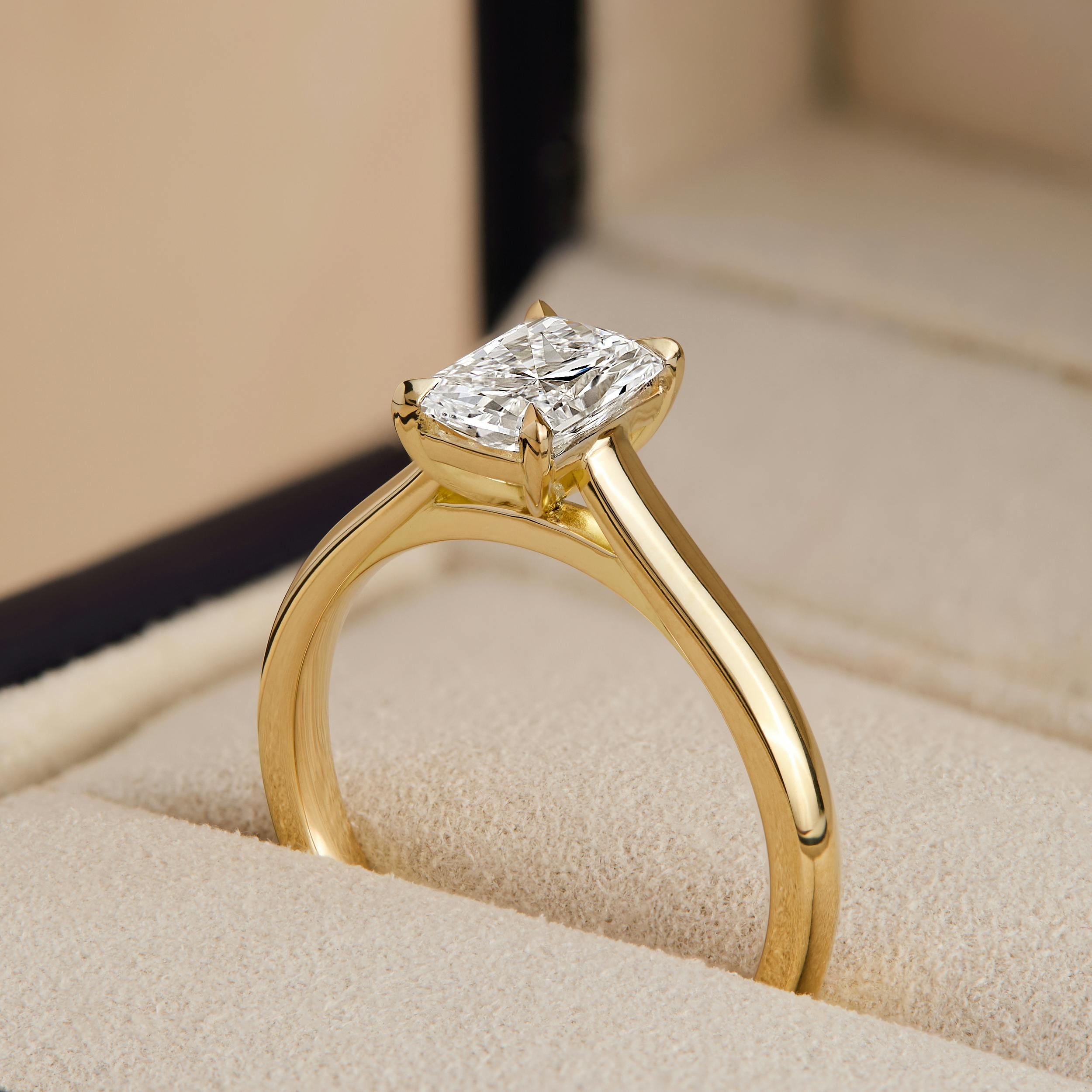 The Bardot engagement ring in 18k yellow gold with a radiant diamond.