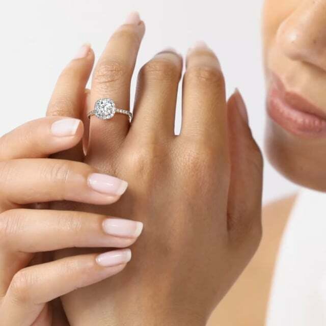 Available with a natural or lab grown diamond, the Classic Kelly is a Queensmith favourite - adored for its pillowy appearance. The setting gives the illusion of a cushion diamond shape thanks to a squared halo with rounded corners - yet set with a round brilliant diamond, offers unrivalled scintillation and sparkle. This wedfriendly design is crafted to sit comfortably alongside a wedding ring.