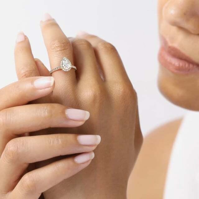 Available with a natural or lab grown diamond, the Classic Oberon is a Queensmith favourite, adored for its timeless appeal and modern finish. A Scallop set diamond halo is set around the circumference of the main diamond, in a refined and stripped-back setting with a matching diamond band. Meticulously set and perfectly calibrated to match in clear and colourless quality, the halo of diamonds enhances the size and sparkle of the main diamond. This wedfriendly design is crafted to sit comfortably alongside a wedding ring.