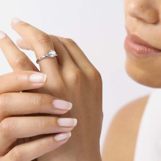 Available with a natural or lab grown diamond, the Lamour offers creative design quirks whilst maintaining an elegant and refined aesthetic. Four compass set claws instantly give the Lamour its contemporary edge, perfectly proportioned and placed for light to pass through the diamond and produce intense sparkle. A split shank joins the claws with seamless, harmonious curves.
