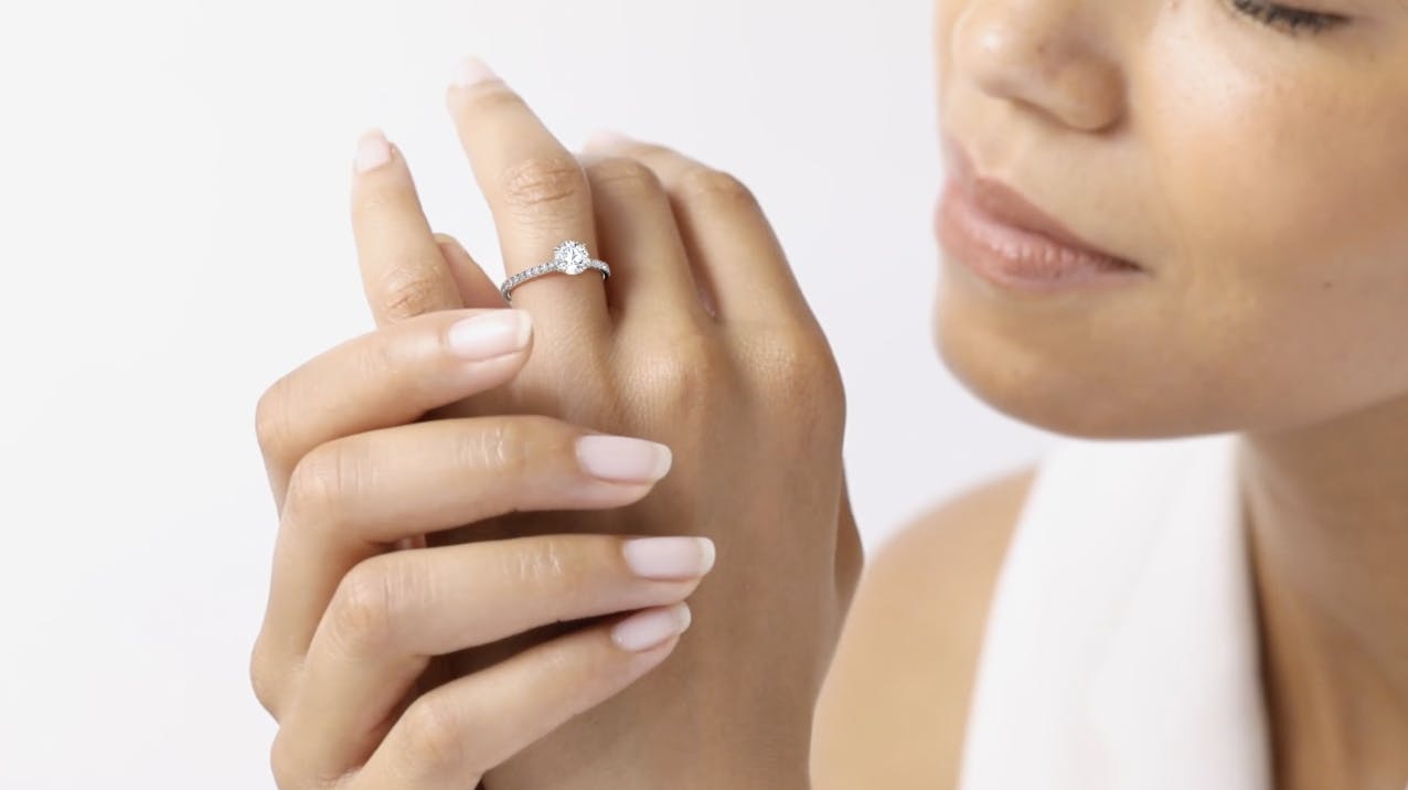 Available with a natural or lab grown diamond, the Quickship Harlow Scallop celebrates simplicity with its minimalist design. Four claws securely hold the diamond in place, neatly joining the diamond band. Open-sided, the Harlow gives the illusion the diamond floats within the setting, allowing maximum light to pass through the diamond to produce a mesmerising sparkle. This wedfriendly design is crafted to sit comfortably alongside a wedding ring.