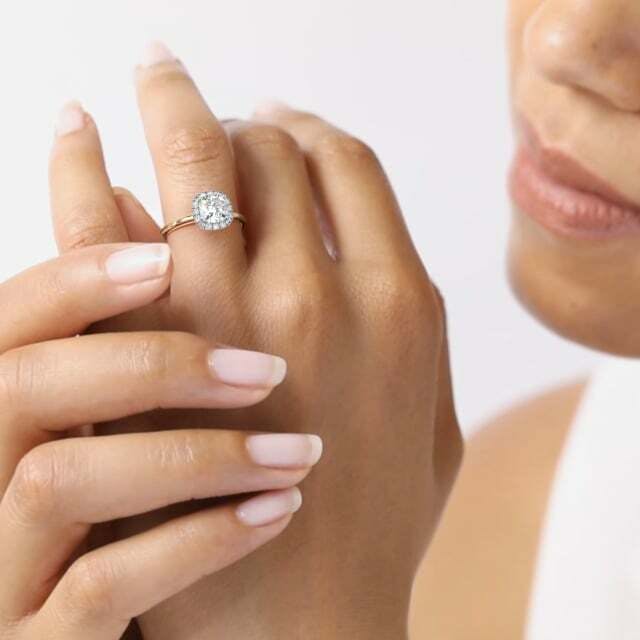The Renée is a contemporary halo engagement ring, with a sublime, stripped-back design. Through careful engineering, we've minimised the metal with this super simple halo ring, featuring one point of contact between the collet and band. The halo of small diamonds are chosen to perfectly match in size, colour and clarity to give a continuous, scintillating sparkle.