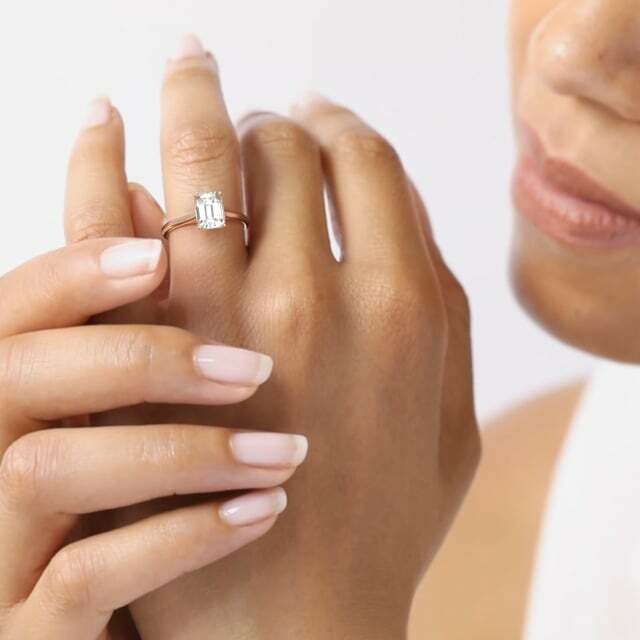 The Temple engagement ring in 18k rose gold with an emerald diamond.