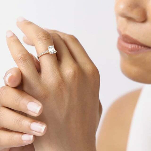 Available with a natural or lab grown diamond, the Temple Pavé features exceptionally refined metal work, styled to a perfectly minimalist design. The four claws of this ultra contemporary ring gather towards the diamond band with beautifully balanced curves. This wedfriendly design is crafted to sit comfortably alongside a wedding ring.