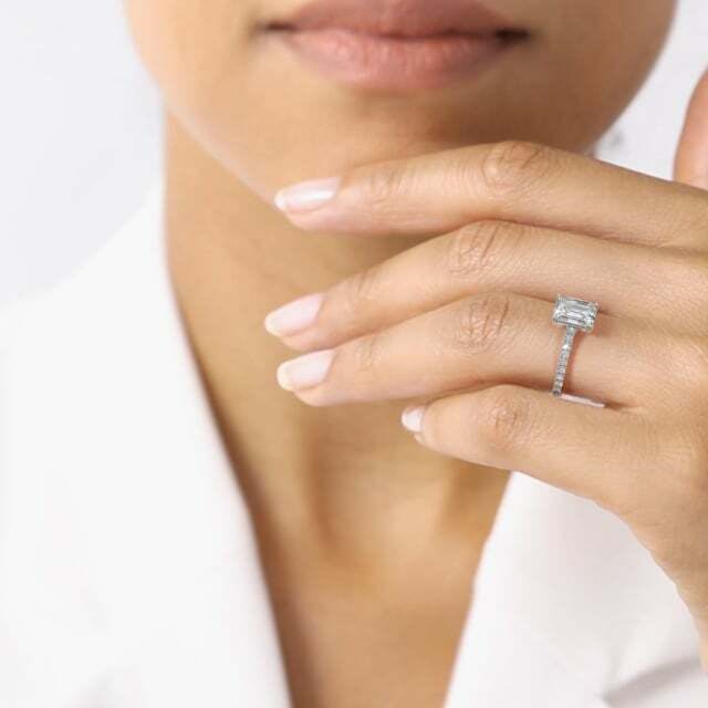 The Temple Scallop engagement ring in platinum with an emerald diamond.