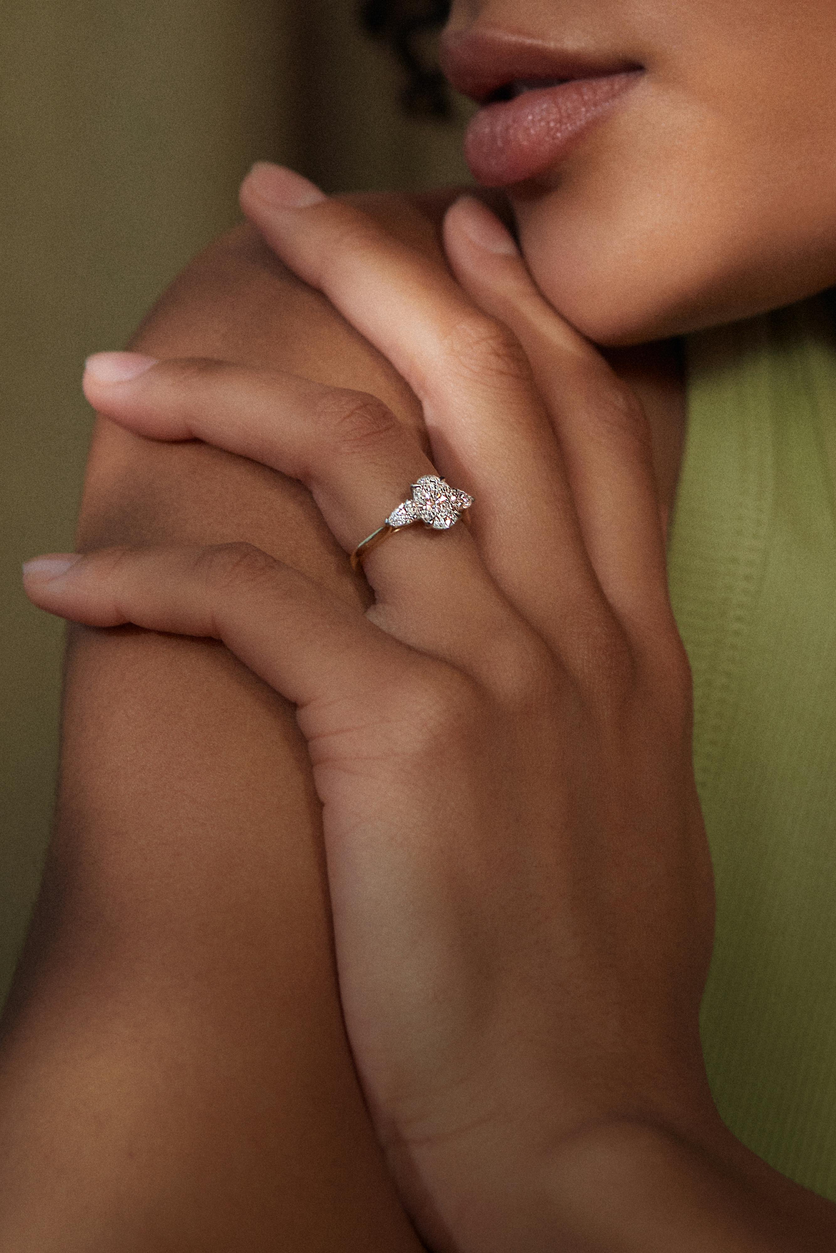 The side stones of your trilogy ring can be any shape, but some shapes work better than others: elongated and tapered shapes set horizontally make beautiful side stones, like pears and tapered baguettes. Round diamonds are also a traditional choice of side diamond for your three stone ring.