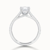 - Halo setting: A cushion shaped halo enhances the centre stone's brilliance.