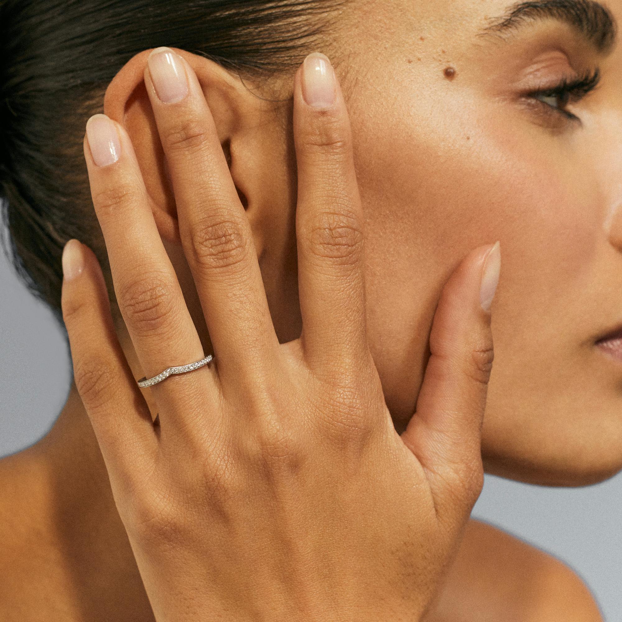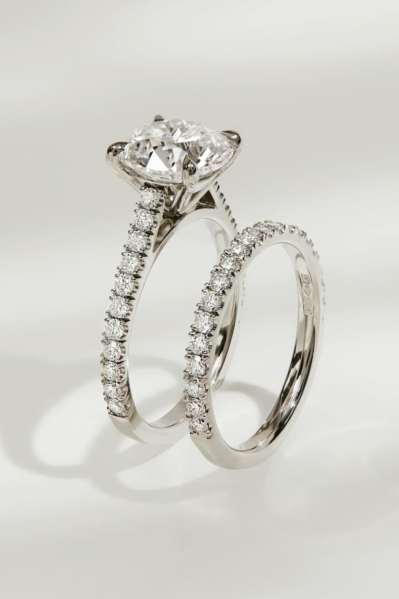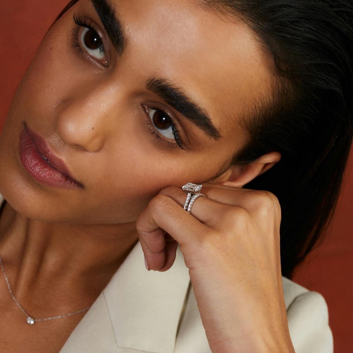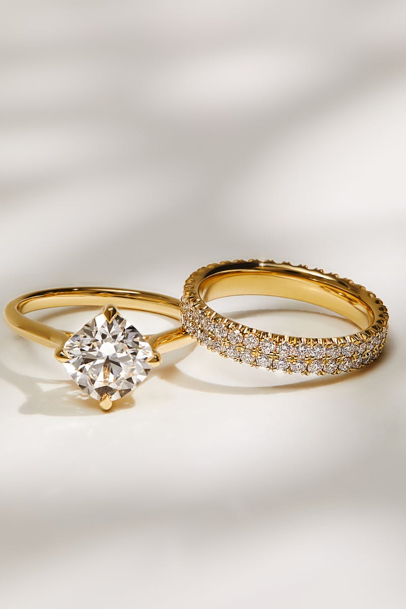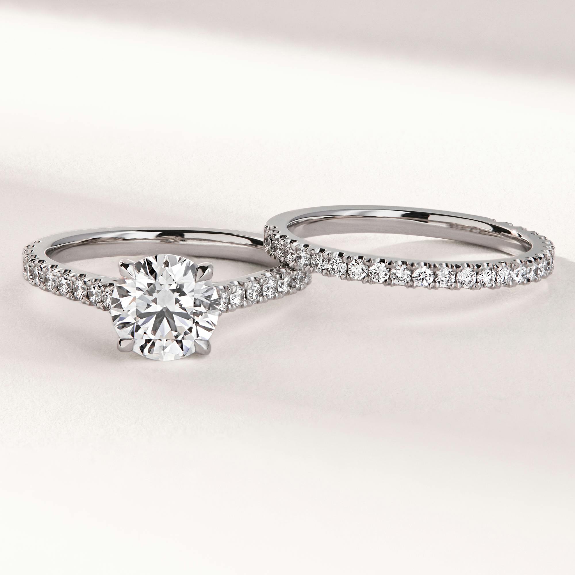 It's useful to consider various factors to ensure a seamless match with your engagement ring. Try matching the setting style, such as whether it is scallop or pavé set, and the metal for a clean, seamless look.