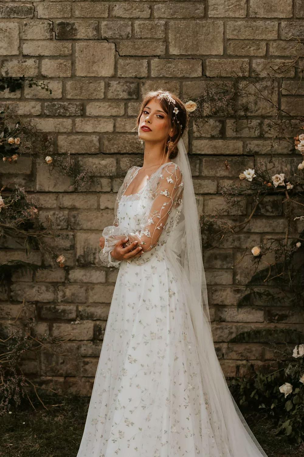 - Amy Mair Couture – Creating bespoke wedding dresses with luxurious fabrics and intricate detailing, Amy Mair Couture offers gowns tailored to perfection, adding a sophisticated touch to any whimsical wedding. The Paris Original gown is a particular whimsical favourite of ours, with its breathtaking botanical and lacy details. Prices start from £2,000. Available for consultations in her Cardiff studio with worldwide shipping options.