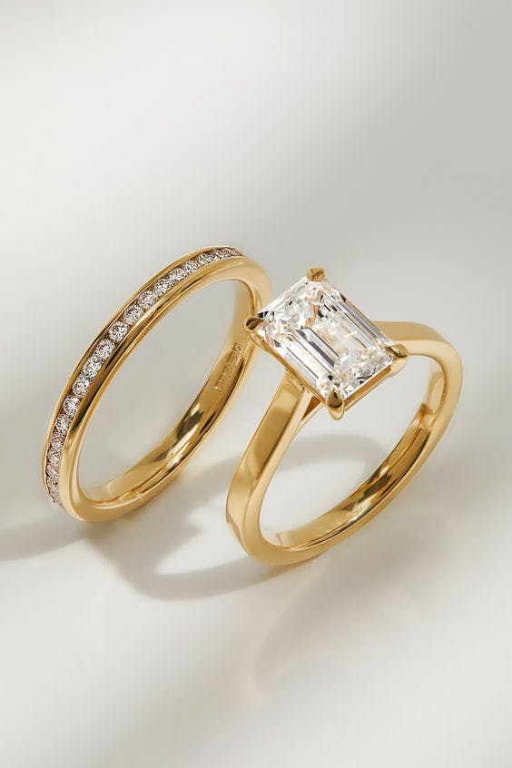 Radiant cut engagement rings offer a dazzling blend of brilliance and modern elegance, making them a perfect choice for a whimsical bridal look. Their unique faceting creates exceptional sparkle, while their sleek shape pairs beautifully with curved or shaped wedding bands for a harmonious and enchanting finish.