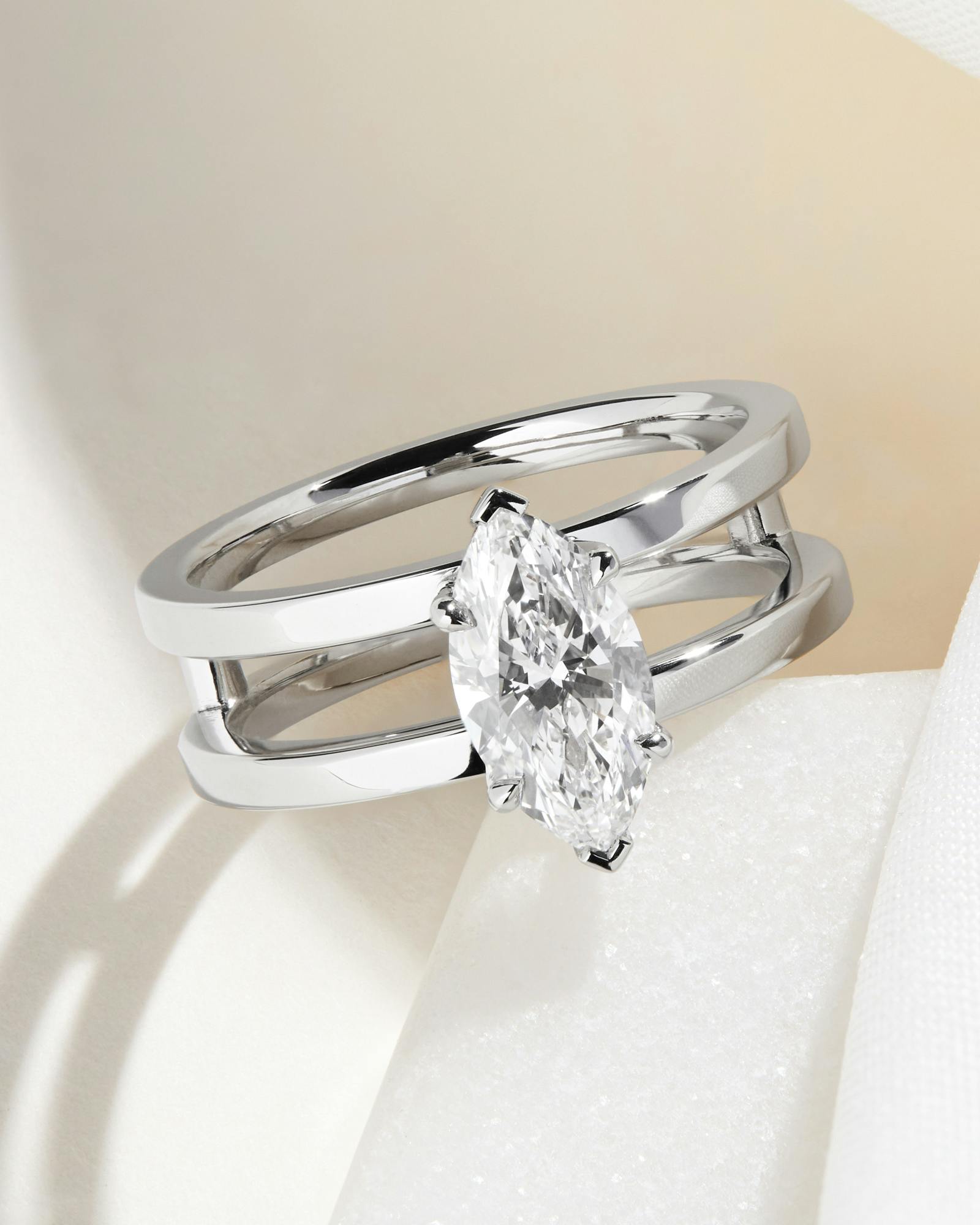 Split band: or a ‘split shank’, is one band that splits into two either side of the centre diamond.