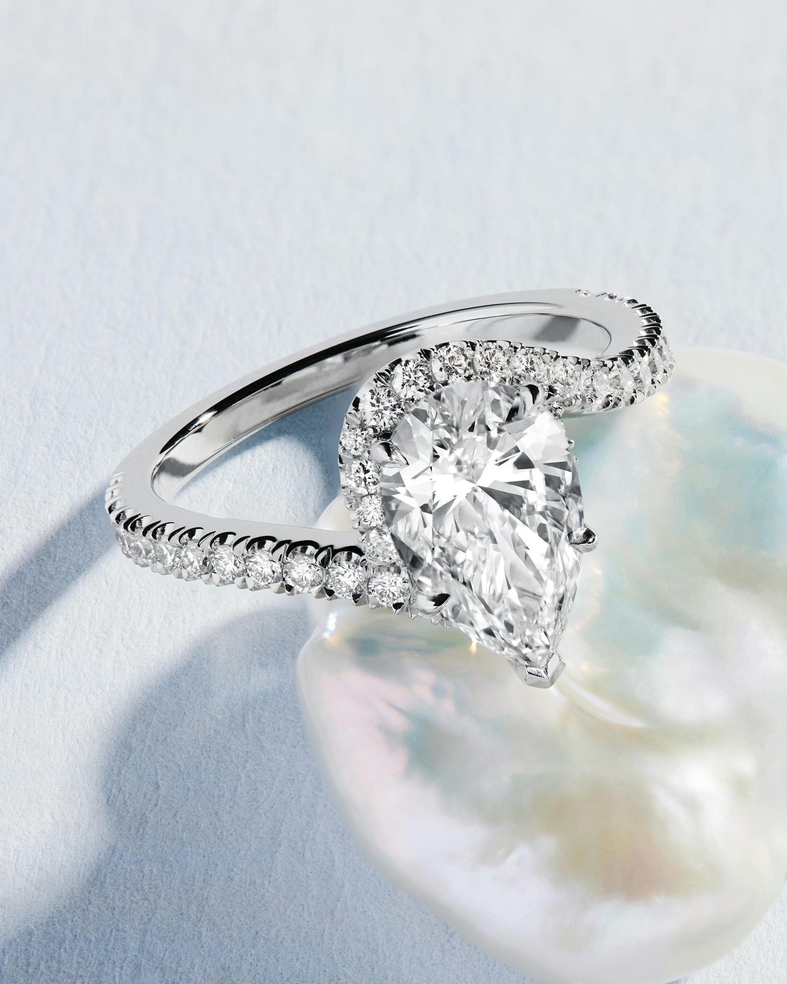 Similarly to the band of an engagement ring, the halo can be set in a number of styles, with scallop and pavé being the two most popular choices. Scallop settings allow plenty of light to bounce around each tiny diamond due equating to intense sparkle. Pavé settings are slightly more metal-heavy, so while a little less sparkly, offer a beautiful vintage appeal.